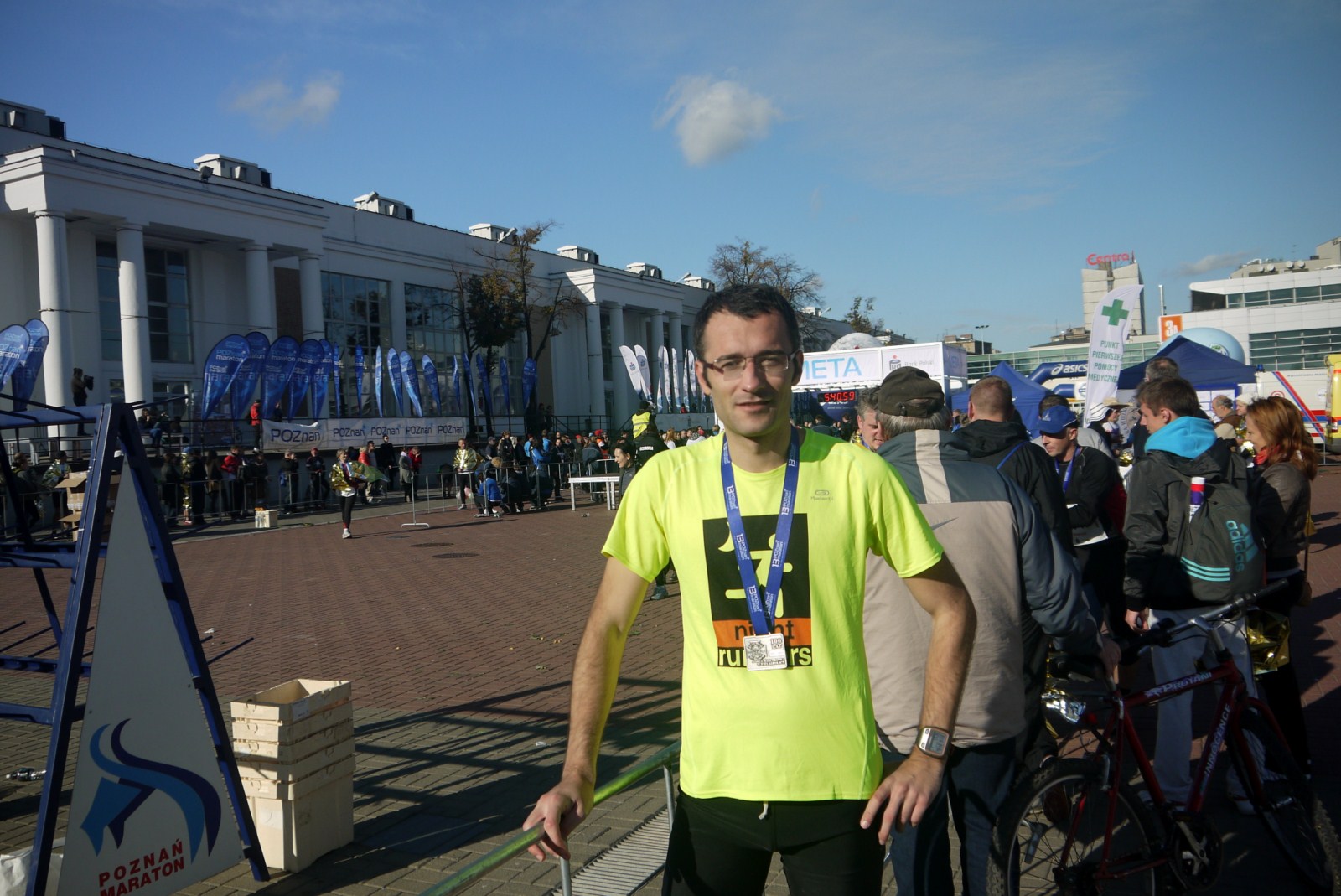 Na MTP pojawiłem się mniej więcej o godzinie 8 i od razu skierowałem się do szatni. To co zwróciło uwagę to tłumy biegaczy i kibiców w okolicach Targów, co podbijało trochę adrenalinę. Wszędzie można było wyczuć atmosferę święta, jakie czekało prawie 5,5 tysiąca biegaczy. Na rozgrzewkę wyruszyłem ok. 8:30, wyszukując po drodze Makosa, któremu chciałem zostawić bluzę po rozgrzewce. Rozgrzewka była trochę na łapu-capu, po chwili wszyscy ruszyli w stronę startu, więc również wyruszyłem, aby ustawić się w odpowiedniej strefie czasowej. Dzień wcześniej planowałem, żeby ustawić się przy pacemakerze na 3:15, ale na starcie ustawiłem się kilka metrów za grupą. Wynik ten stanowił dla mnie cel optymistyczny, ale nie wiedziałem czy dam radę wytrzymać takie tempo przez cały bieg. Stanąłem więc w tłumie ludzi i czekałem spokojnie na start biegu